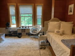 In HS, Kaitlyn Kelly ’22 and Jackson Kinsler ’22 split the old common room with two-story high ceilings, exposed wood beams, and chandeliers on each side (that’s a whole lot better than those typical fluorescent lights!). Kinsler has two french doors on her half and enough room to run laps—no need for the outdoor track! Kelly has built in shelves and a large closet space that used to be the kitchenette. Is there anything such as too much storage space? Probably not with the amount of clothes kids bring to school these days. New England weather is so unpredictable though!