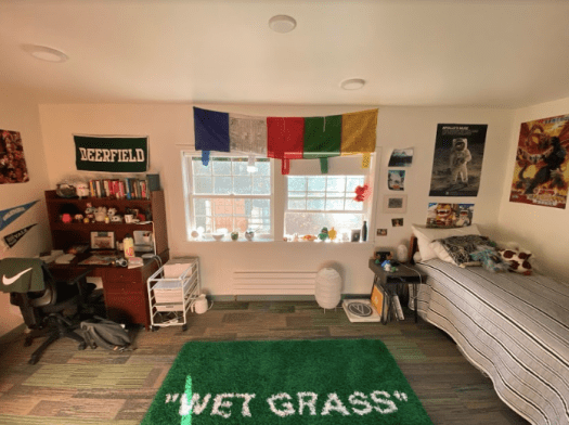 Many of the students who received these makeshift rooms enjoy special perks not seen in a typical dorm room. Kate Stenger ’22 lives in the Poc 2 common room where she gets to enjoy a corner room three times the size of a regular Deerfield “closet” room with multiple windows looking out onto Old Main Street, a wall of built-in shelves, and her very own bathroom. No need for sharing a sink with twelve other kids.