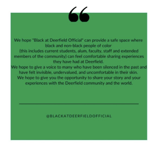 The posts on @blackatdeerfieldofficial span thirty years of racism at Deerfield. “It is shocking at times… The content remains the same because little has been done by the administration to foster the change we wish to see on our campus,” the account’s team said.