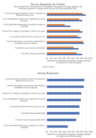 Asked to explain the discrepancy between boys and girls, Cornelia Streeter ’23 said, “I know a lot of other women who are afraid to express their opinions for fear of being judged. [Sometimes I wonder,] if I express my opinion, will I be attacked by others, mostly men? When I’m nervous about expressing an opinion, it’s usually not to other women—it’s to men.” Peer Counselor Emily Rice ’24 said, “I think in terms of expressing your opinions, there might be a fear of being disregarded or not taken seriously, which would displace peoples’ (specifically girls’) confidence as to how they express their views at Deerfield.”